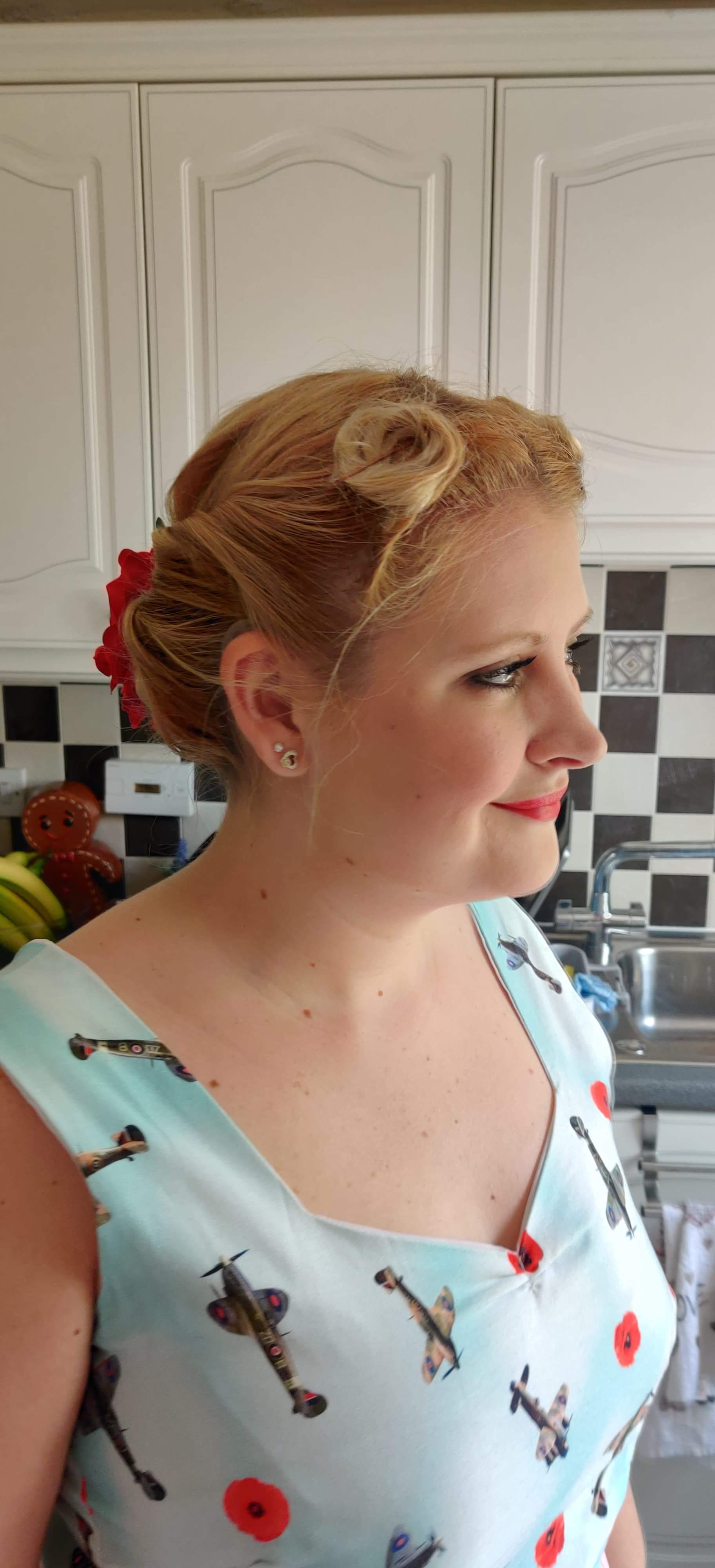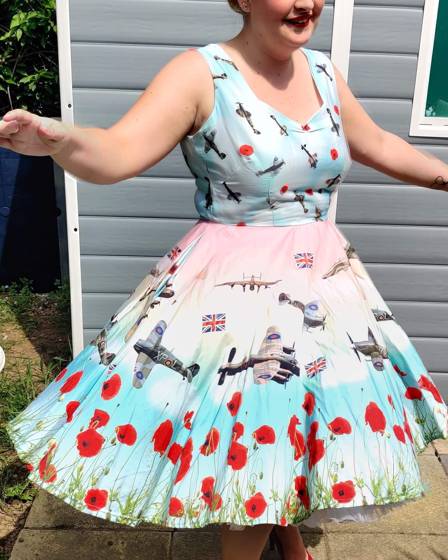 So here is my outfit. I love this dress because the style is so classic and it also has two of my favourite things on the print – vintage aircraft and poppies. I’ve paired it with my red high heels from Marks and Spencer and am wearing a petticoat from a local dressmaker to puff out the dress. What do you think?